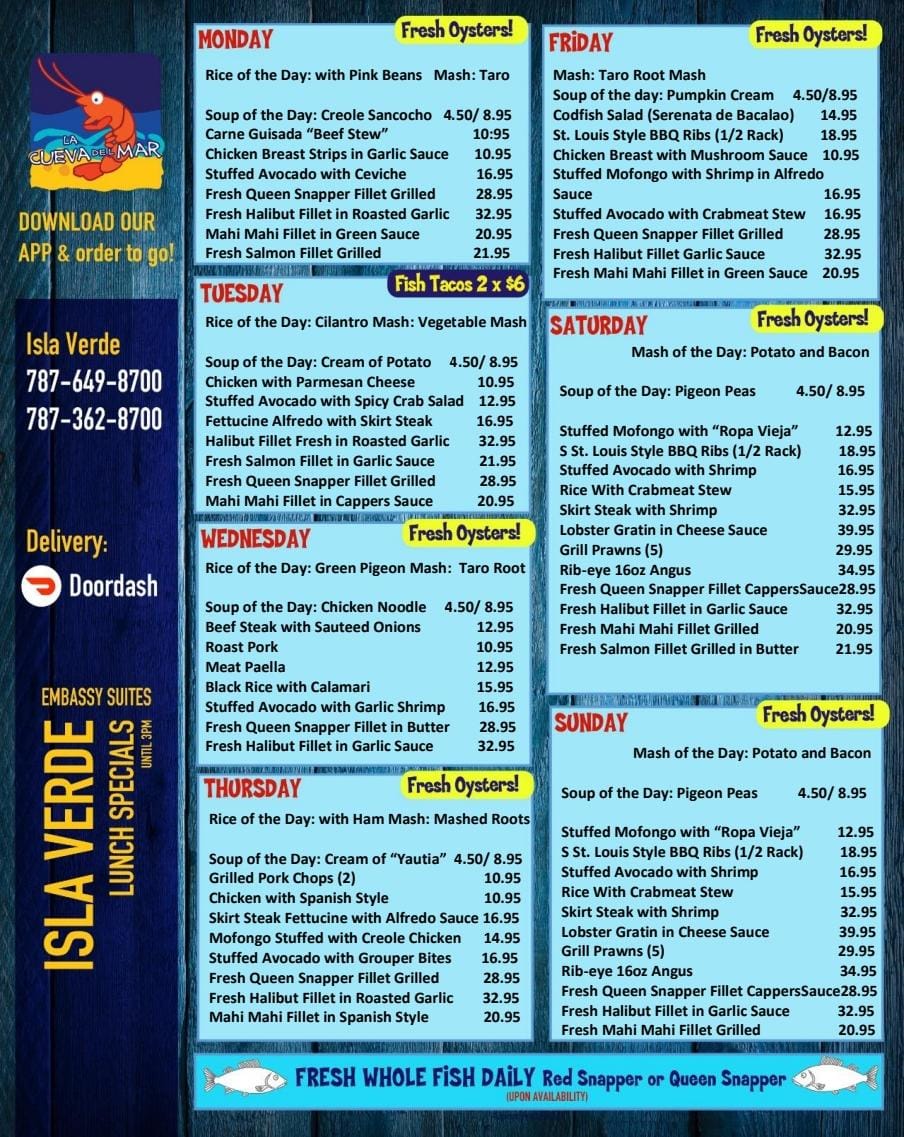 Welcome to La Cueva del Mar Isla Verde! Located in the vibrant heart of San Juan, Puerto Rico, this gem specializes in bringing the flavors of the sea to your table. The menu features an array of options, highlighting fresh seafood alongside beloved local dishes.